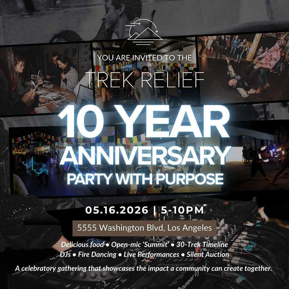 TREK RELIEF @ 10! Join us in LA on May 16, 2026. #PartyWithPurpose